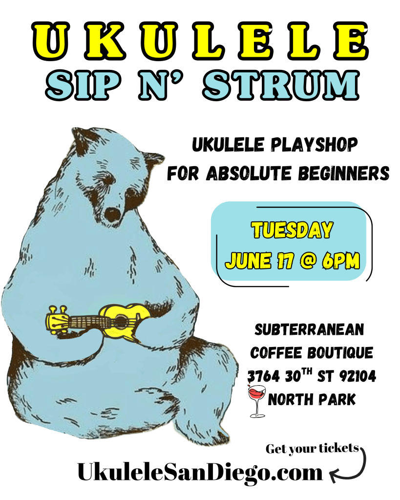 Thursday, June 17 at 6 pm. Ukulele Sip N’ Strum – North Park at Subterranean Coffee Boutique.